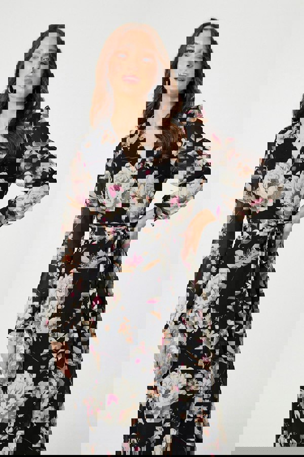 Make an elegant statement at your next event with this floral wrap midi dress. Designed with an asymmetric silhouette, it features a flattering wrap front and adjustable tie waist that gently defines your shape while offering a comfortable, personalised fit. The layered hem adds soft movement, creating a flowing finish that looks beautiful as you walk or dance.