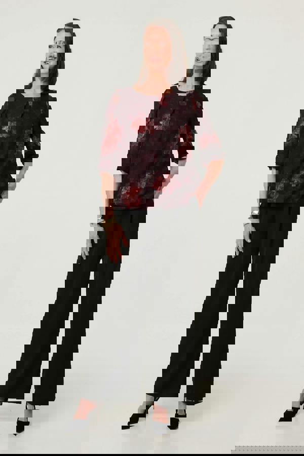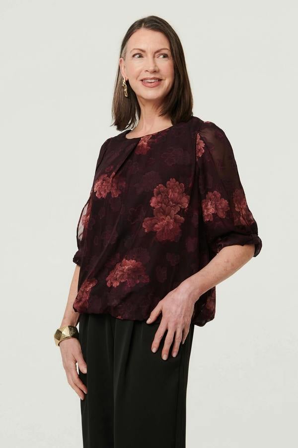 Style this beautiful blouse with smart jeans or a denim skirt for the perfect evening outfit. It's made from luxuriously soft textured mesh, with puff 1/2 sleeves and a ruched round neckline. It's layered for modesty and has a hip length hem.