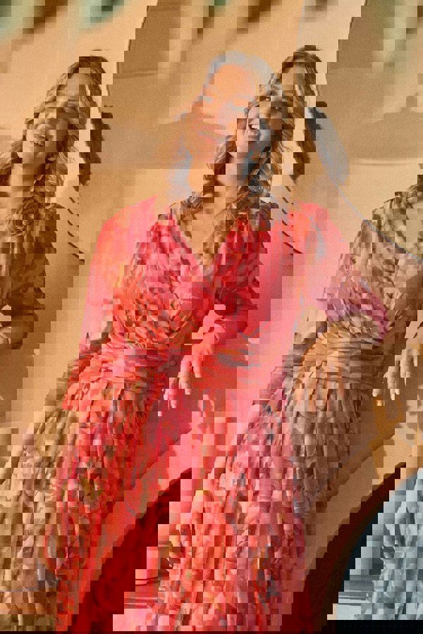 This flattering dress has a wrap shape that will cinch in your waist, thanks to a ruched panel. It also has elegant pleats for a figure-slimming look. It's finished with a semi sheer mesh layer, 3/4 sleeves and a classic v-neck. Style this dress with your favourite heels to match with a smart dress code.