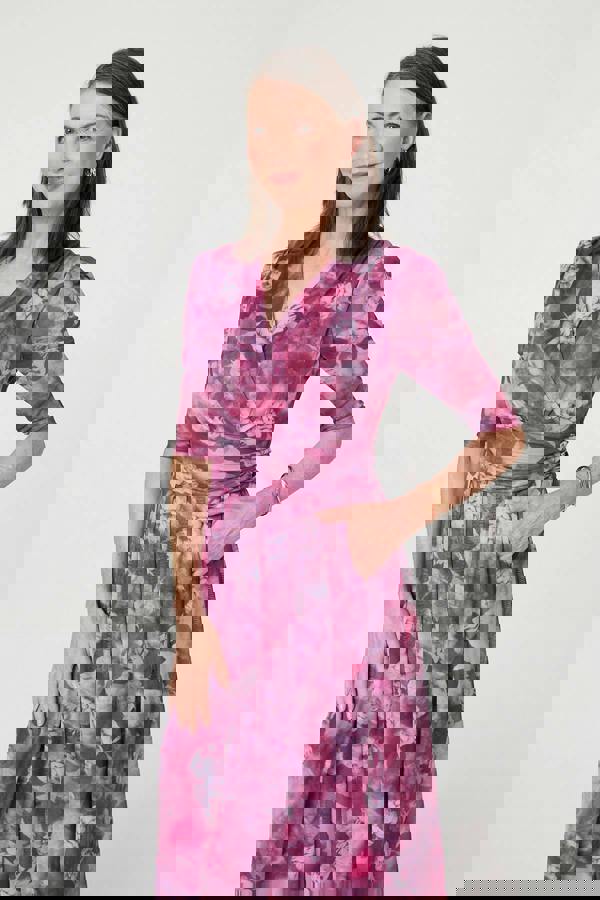Dress for special occasions in this beautiful midi dress. It features a tummy-flattering wrap shape, with a ruched waistband and front pleats. This dress also has 3/4 sleeves, a v-neck and a semi sheer layered texture for extra movement. It even has hidden pockets! Wear this dress with nude heels at your next event.