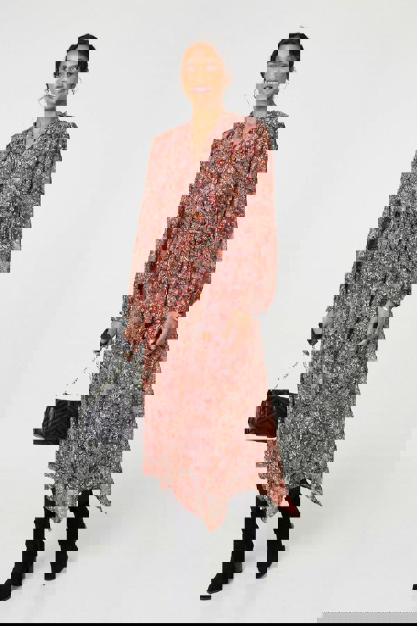 Look effortlessly stylish with this bohemian-inspired midi dress. It has a v-neck with a tie detail, as well as a tie waist. This dress has a semi sheer layer and a hanky hem, along with long puff sleeves for a laid-back yet professional look. Style with your favourite boots and layer up with tights if the weather looks chilly outside.