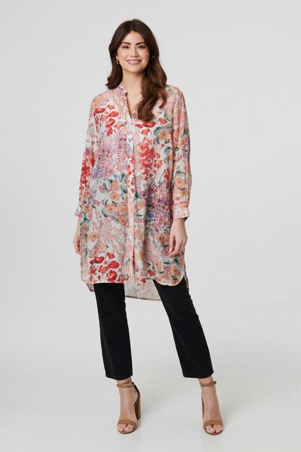 Go for a relaxed and summery look in this longline shirt. The hem reaches knee length and it's made from a soft semi sheer viscose blend material. It also has a v-neck, buttons and long sleeves. Wear it over jeans or leggings and simply trade trainers for heels to dress up for a smart event.