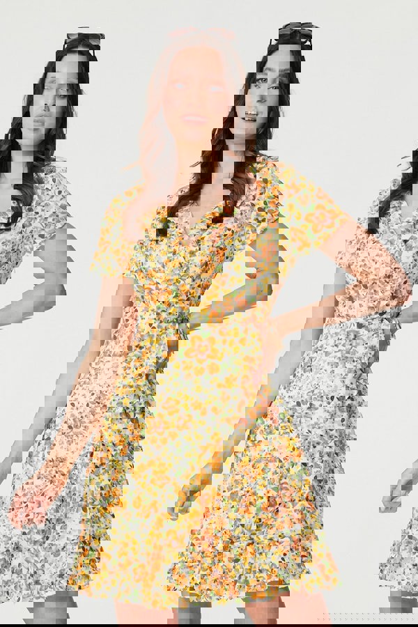 Stay summer-ready wearing this short wrap dress. It has a waist tie, ruffled v-neck front, short sleeves and a short ruffled hem. Keep it simple with your favourite sandals and a sunhat on a warm day.