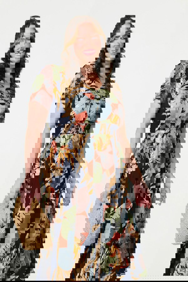Stay comfortable and stylish in this midi dress. It's made from soft 100% viscose fabric that will stay breathable, even on a hot day. It has short sleeves, a v-neck, pockets and a shirred waistband that will flatter all figures. Dainty buttons add an elegant finishing touch. Style it alone or layer up with knitwear on a chilly day.