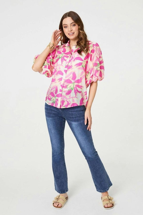 Get ready for a day at work or any smart-casual event with this stylish shirt. It has a collar and front buttons, along with 1/2 puff sleeves and a boxy fit. Wear it with smart jeans or relaxed trousers for office-ready elegance.