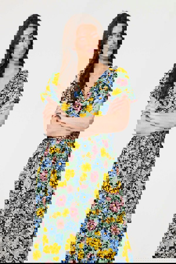 Make a stylish statement in this vintage floral maxi dress. With a v-neck, short puff sleeves, a cut out back, a side split and a straight maxi skirt. Style with strappy heels for a wedding guest outfit.