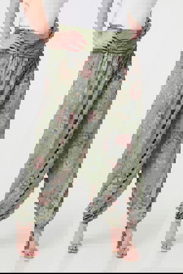 Make a statement in comfort with these vintage rose print harem trousers. With a high waist, a ruched jersey waistband, loose fitting legs and an elasticated ankle cuff. Style with a white t-shirt and strappy sandals for the ultimate comfortable daytime outfit.