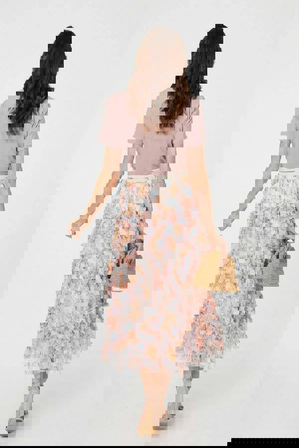 This midi skirt is a must-have for your summer wardrobe. It has a semi sheer mesh texture, with layers of ruffles to create a playful tiered effect. Thanks to a high waist with a stretchy fit, it will look flattering and feel comfortable at the same time. Wear with heeled sandals and a nice top for an evening out.