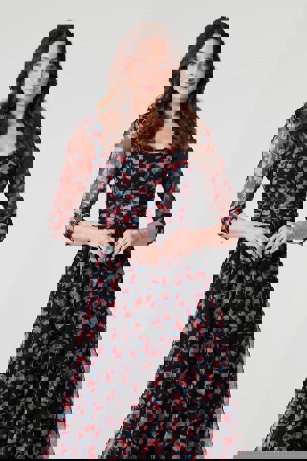 For your next formal event, dress to impress in this beautiful midi featuring a mesh semi sheer layer with ruched details at the waist. It has 3/4 sleeves and a round neck, along with a midi length layered hem that will look stunning as you twirl on the dance floor at a wedding or party.