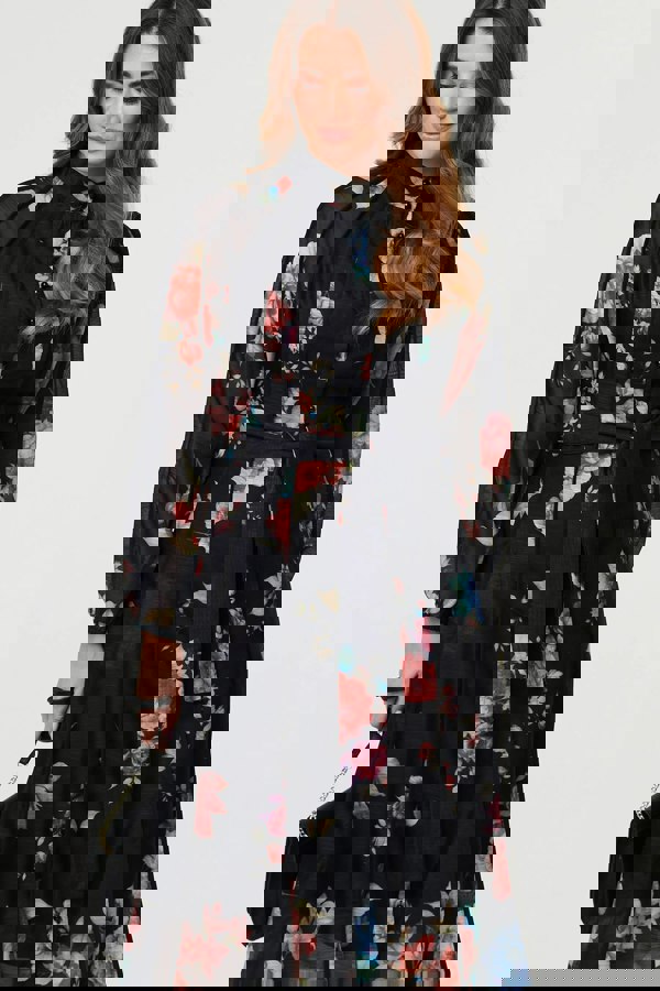 This beautiful dress has a semi sheer layer, long sleeves and a figure-flattering tie waist. It features buttons, a high neck and a textured trim. Wear this dress with heels and a clutch for an evening out, or tights and boots for a smart daytime outfit.