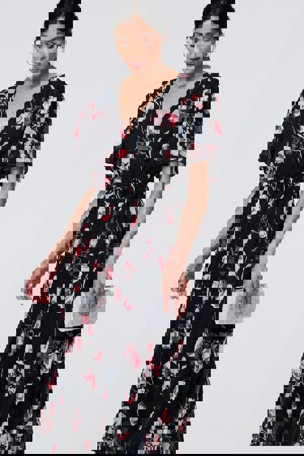 At your next formal event, dress up in this elegant midi dress. It has semi sheer 1/2 sleeves and a ruched mesh layered skirt. Adjust the fit on this wrap dress by tightening or loosening the tie waist. We love this simple dress paired with heels and a clutch bag when worn to a wedding or other formal evening plans.
