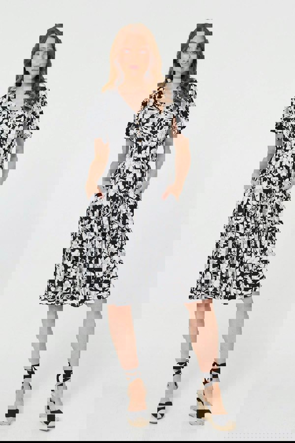 Get a classic look in this feminine dress. It has short angel sleeves and a v-neck, with a shirred waist that will flatter your figure. Dress it up with heels or keep your outfit casual with white trainers and a denim jacket.