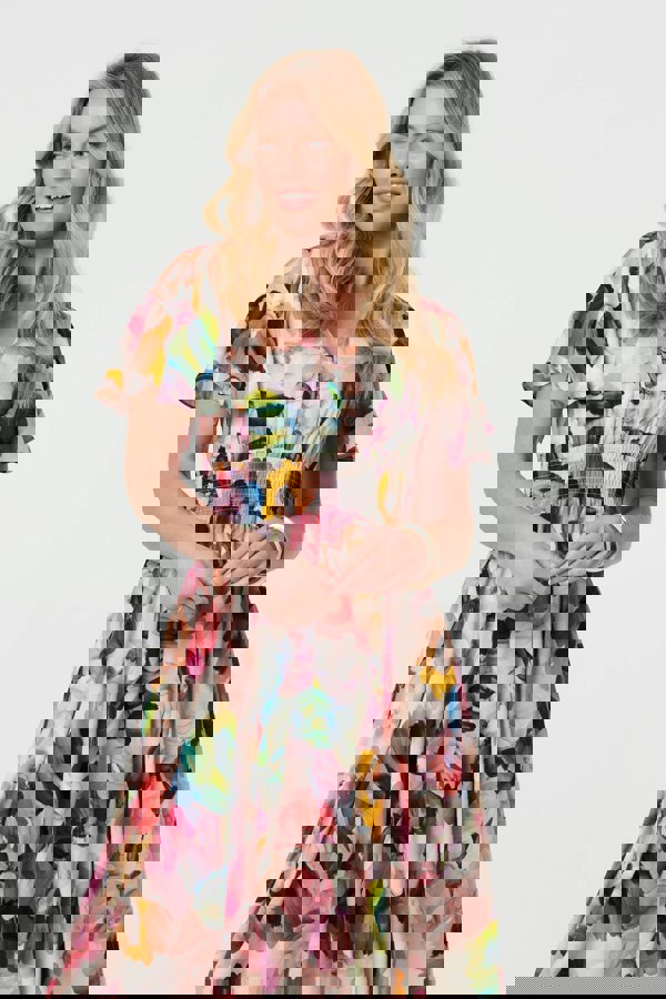 Step into summer wearing the perfect midi dress. It has a v-neck, short angel sleeves and a tummy-flattering shirred waistband. The v-neck includes a row of elegant buttons that can be worn fastened or loose. Thanks to 100% viscose and a relaxed skirt, you'll stay comfortable even on a hot day. Wear it with smart heels for a special occasion, or comfortable flats for a day at the office.