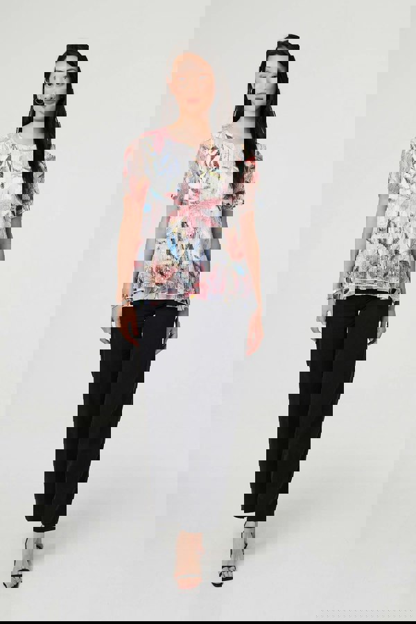 This layered top has a beautiful mesh texture and layered shape. It has short sleeves, a round neck and a hip length hem. Wear it with a smart midi skirt for a special occasion, or keep it relaxed with blue denim.