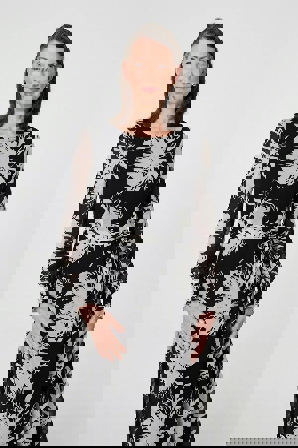 This flattering dress has a tie waist and an a-line shape. The semi sheer layer and long sleeves will add a beautiful finishing touch to your look, meaning this dress is perfect for special occasions. It has a round neck and a maxi length hem.