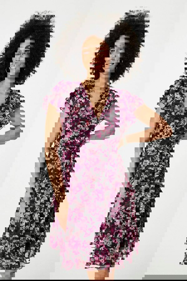 Nothing suits summer quite like a ruffled mini dress. This one has a tiered short hem and a flattering waist tie that will accentuate your curves. It also has ruffled angel sleeves and a v-neckline.
