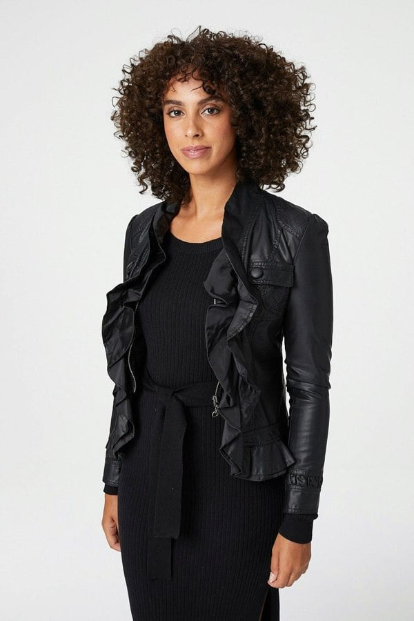 Add a statement making faux leather jacket to your closet with this frilled detail front style. With a zip front v-neck, long sleeves, slim tailored fit sitting at the hips. Layer over a knitted bodycon dress and knee high boots for a chic day to night look.