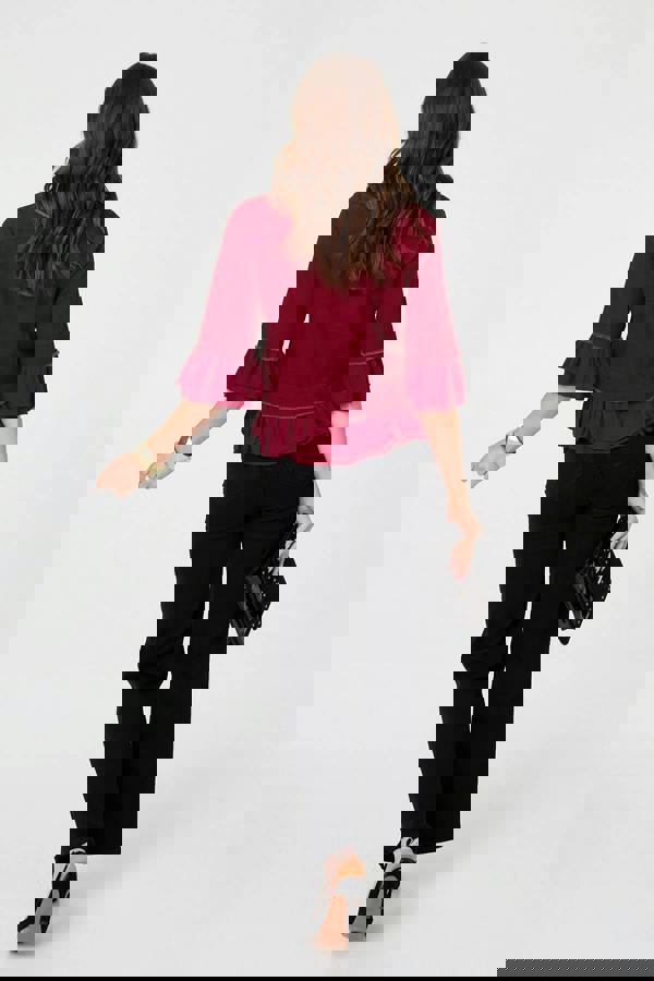 Flatter your figure with this smart peplum-style shirt. It has a beautiful frilled detail around the hem and 3/4 sleeves, giving it a floaty and feminine look. It also features a collar and buttons. Wear it for the weekend with blue jeans, or elevate with a fitted skirt for a smart occasion.