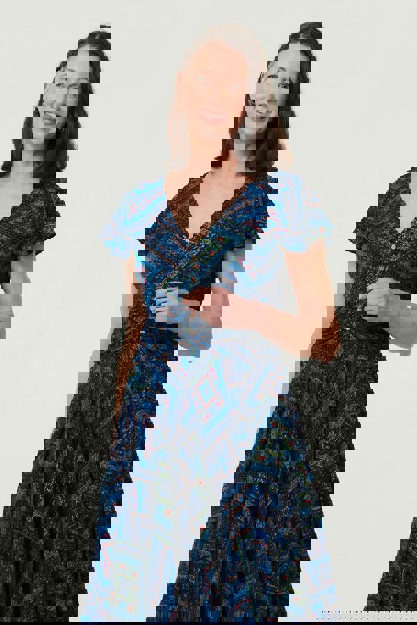This comfortable maxi dress will look elegant with heels at your next special occasion. It has a v-neck, cap sleeves and button details on the front. Get a figure-flattering look with a ruched waistband that ties at the back for the perfect fit.