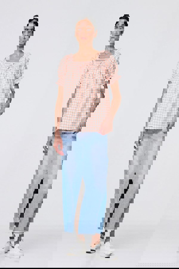 Add a classic gingham check to your summer closet with this pretty blouse. With a square neck, short puff sleeves, a faux tie front and a loose fit. opt to wear the sleeves on the shoulder for more coverage or off-the-shoulder for a dramatic silhouette. Pair with a deep blue denim trouser and sandals when the sun is shining.
