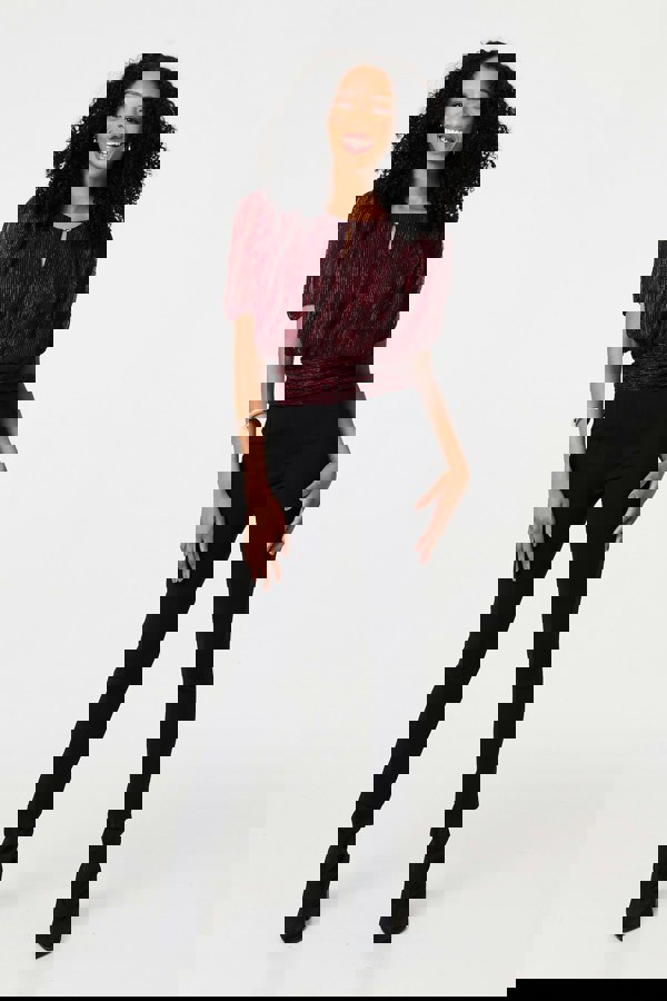 Get ready for a special occasion in style with this glittery crop top. It has a flattering ruched texture that will have a slimming effect on your figure - plus it's sparkly! The short sleeves are semi sheer and it even has an elegant keyhole neckline. Wear with trousers, skirts or jeans at your next special occasion.