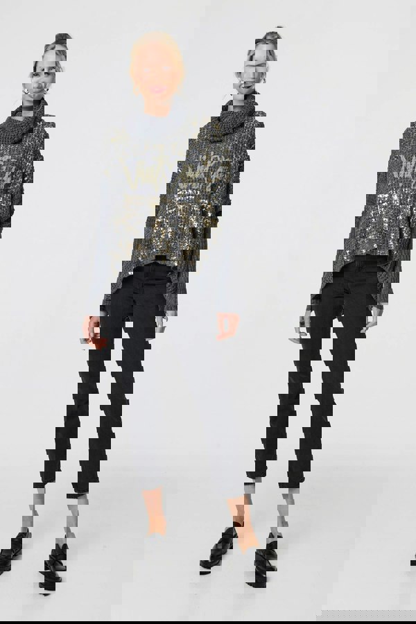 This metallic jumper is ideal for staying cosy and stylish on a casual day out. It has a graphic heart print as well as a metallic knit texture on the front for extra shimmer. It also has a roll neck, long sleeves and drop shoulders. The relaxed fit and curve hem will look laid-back and effortless styled with jeans or a skirt.