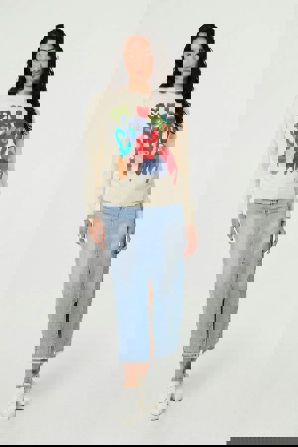 This statement jumper has an eye-catching print on the front and looks effortlessly chic with blue denim. It also features long sleeves with drop shoulders, a boxy shape and a round neck.