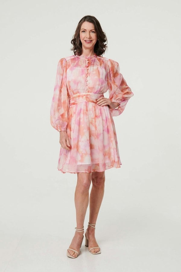 Dress for special occasions in this beautiful short dress. It features a semi sheer layer that will float elegantly as you dance the night away at a wedding, or steal the show at another smart dress code event. It has long puff sleeves, a ruched waist and front buttons. The high neckline is finished with a frilled trim as a special finishing touch.