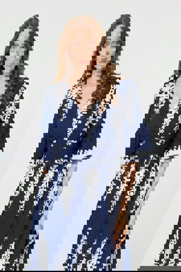 This beautiful midi dress will have a tummy-flattering effect on all figures, thanks to a stretchy shirred bodice and front ruches. It also has a tiered skirt, 1/2 flared sleeves and a v-neck. Wear with heels and a clutch bag at your next special occasion, such as a wedding or party.