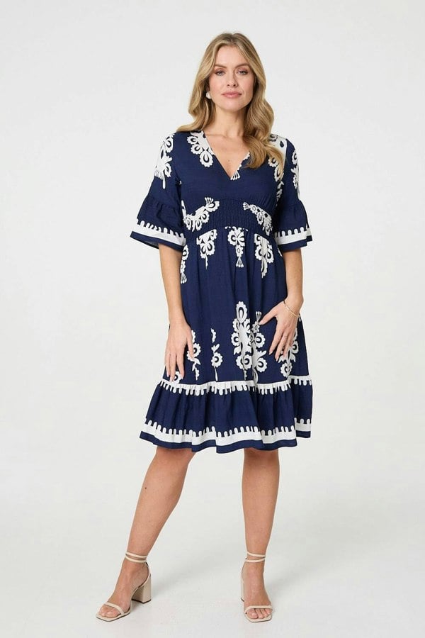 Perfect for warm-weather styling, this ikat print short dress combines effortless elegance with everyday comfort. Designed with a flattering V-neckline and softly flared half sleeves, it features a relaxed silhouette that’s easy to wear all day long. The shirred empire waist gently defines your shape for a tummy-flattering finish, while the short hemline keeps things cool and breezy in the heat. Crafted from a lightweight viscose blend, this dress is ideal for holidays, weekends or casual daytime plans. Simply add sandals or espadrilles for an easy summer look.