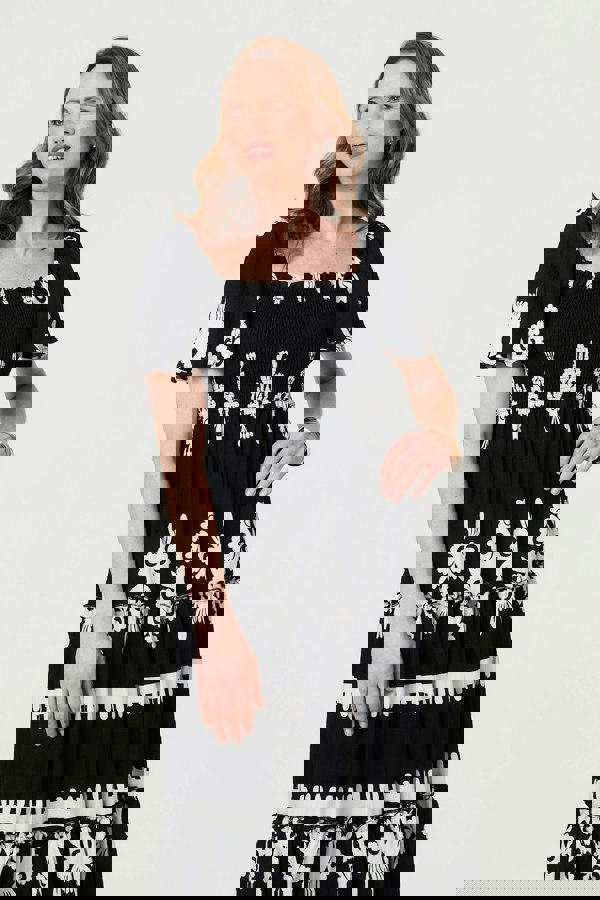 The shirred bodice gently shapes the waist for a tummy-flattering fit, while the pleated, tiered skirt adds graceful movement with every step. Finished with delicate frilled trims and crafted from a breathable viscose-blend fabric, this maxi dress is an easy choice for holidays, summer gatherings or casual occasions.