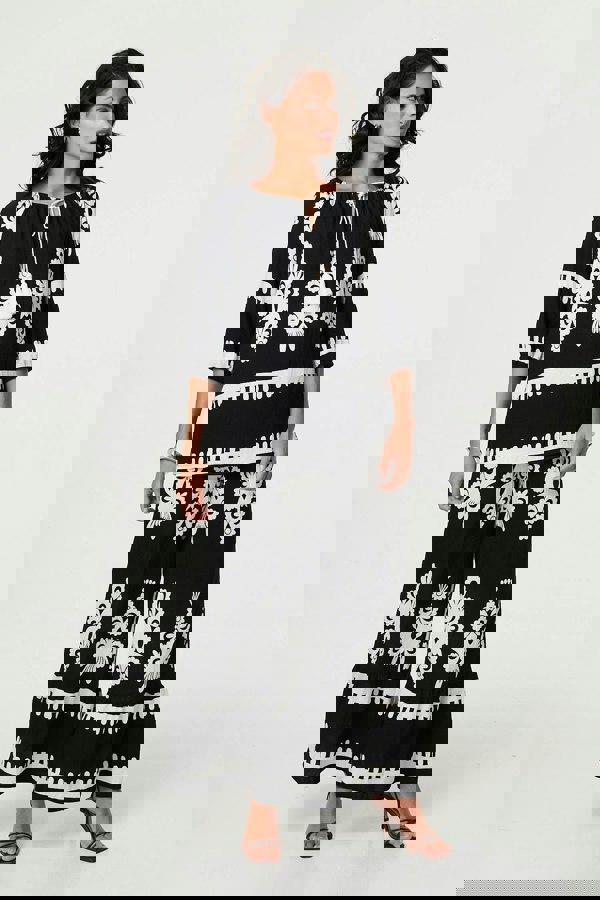 Dress for warm weather in style in this beautiful blouse. It has a drawstring neckline that can be adjusted with the elegant tassel tie. It also has 3/4 sleeves, a relaxed fit and a hip length hem. On a warm sunny day, wear this blouse with your favourite linen trousers or shorts.