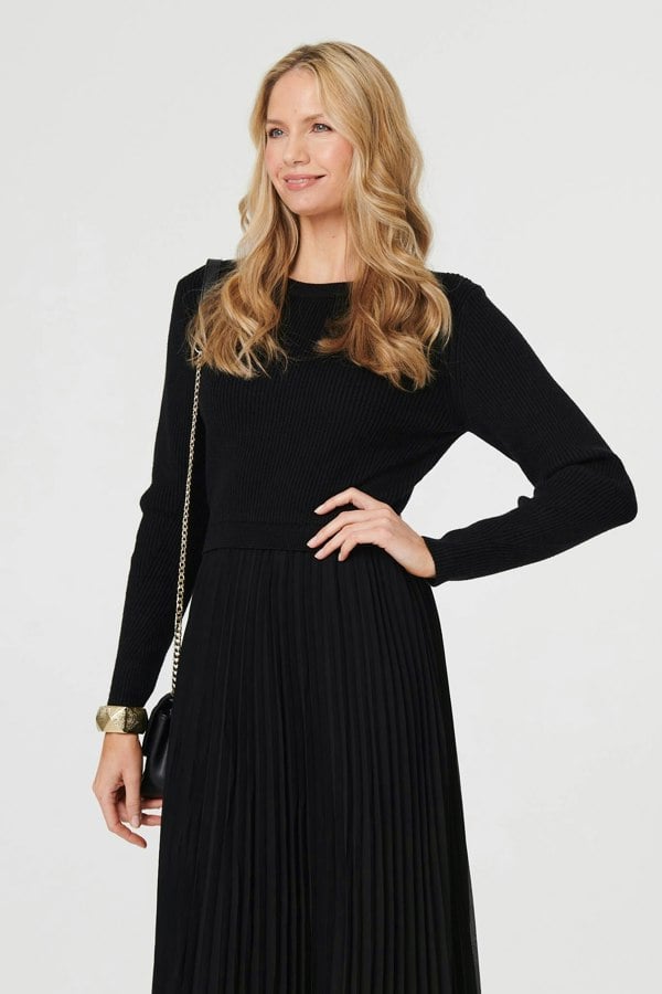 Get an effortlessly elegant look in this comfortable maxi dress. It has a knit top, with a contrast texture skirt that has a flattering ruched effect around the waist. It features long sleeves, a round neck and a maxi length hem. Wear this simple-yet-stylish dress with your favourite boots on a chilly day.