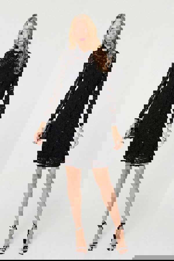 This stylish short dress has a lace layer, made from a soft semi sheer fabric. It has long sleeves and a flattering skater shape with pockets, a collar and front buttons. This dress is a must-have for formal or smart-casual events. Wear with tights and heels for a simple office-ready outfit.