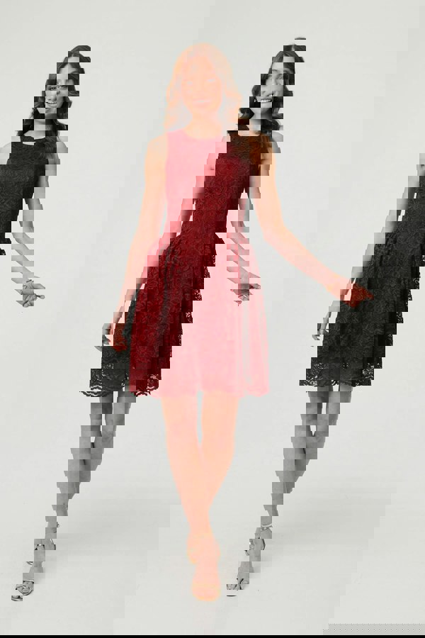 Dress for a special occasion in style with this beautiful short dress. It has a flattering skater shape, complete with ruched details and a drop waist. The sleeveless round neck bodice and semi sheer lace layer over the top will add an elegant, feminine look to your outfit. Wear this dress with your favourite heels for a glamorous evening look.