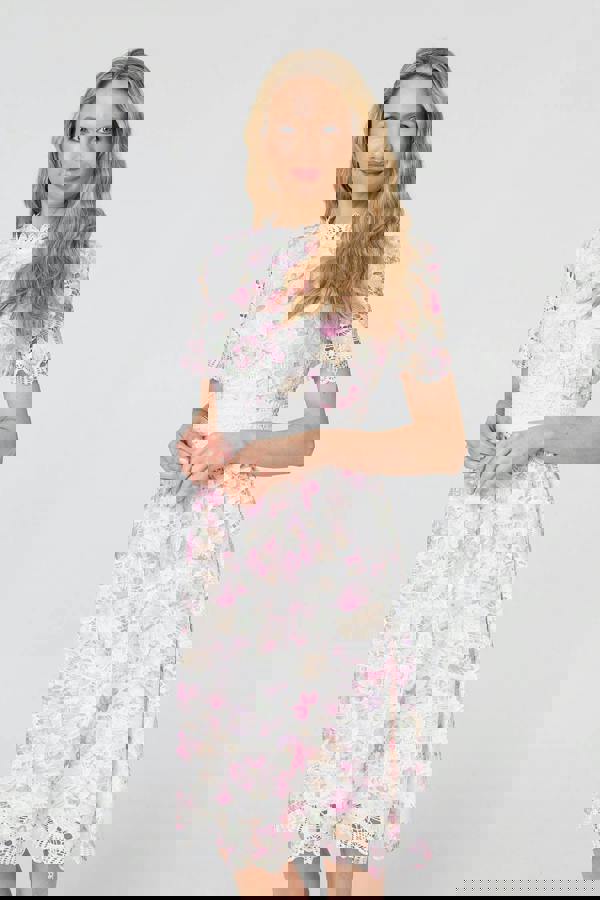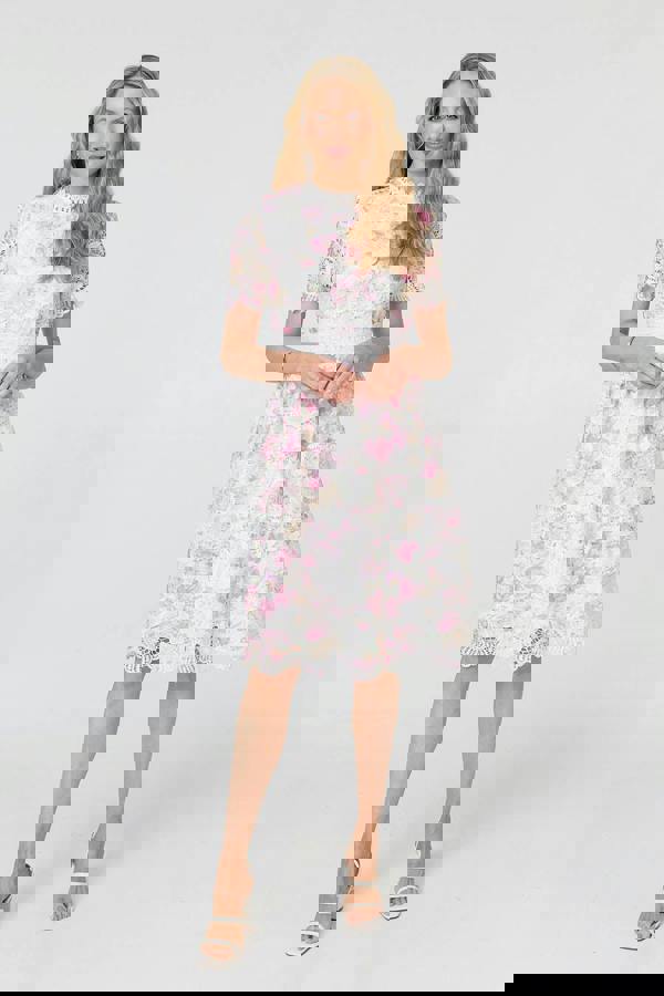 This beautiful lace trim dress has a flattering skater shape, a layered texture and semi sheer details. It's finished with lace around the sleeves and the high neck, and it has a knee length hem for a relaxed look. Wear it with your favourite heels for the perfect evening outfit.