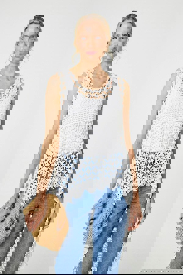 Add a pretty lace top to your closet with this boho inspired lace vest top. With a round neck, wide straps, a loose fit and a dramatic high low hem. Style over a swimsuit and shorts for a poolside cover up or layer over a vest top and jeans with sandals for lunch.