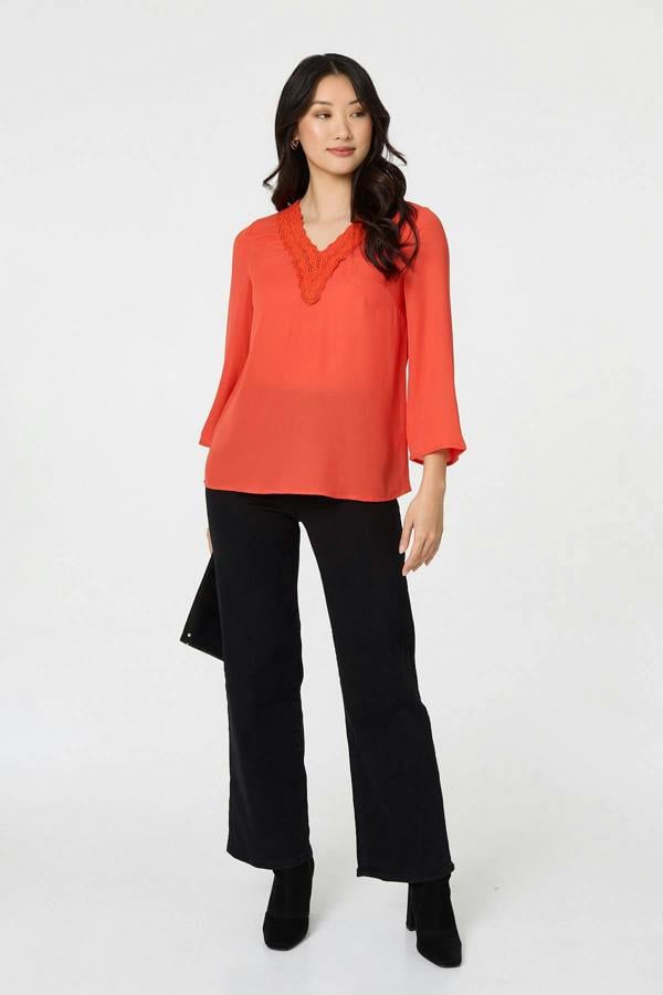 Bring a refined finish to everyday dressing with the Izabel London Lace Trim 3/4 Flare Sleeve Blouse. Cut in a relaxed fit, it pairs a V-neckline with lace trim for a clean, considered look that works well for workwear and off-duty outfits alike. The 3/4 sleeves are shaped with a flared silhouette, adding subtle movement while keeping the overall style easy to wear.