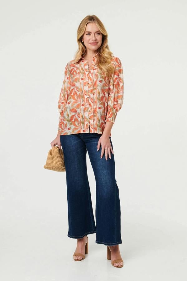 Dress for smart or smart casual occasions in this beautiful blouse. It has long balloon sleeves, elegant lace trims and a classic collared v-neck. It also features buttons on the front and ruched details on the back. Wear it with wide jeans for the perfect daytime and evening outfit.