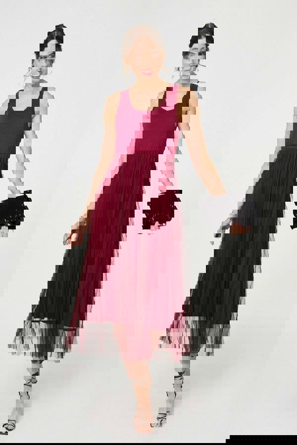 This elegant midi dress can be styled in two ways, so it perfectly fits any dress code. It's made from semi sheer mesh material and has a floaty pleated skirt, as well as an empire waist on the sleeveless top. This dress also comes with a relaxed knit jumper to layer over the top. It has a v-neck, 3/4 sleeves and a curved hem to create a relaxed look. However you style this dress, it's sure to match any smart or casual dress code simply by adjusting the shoes or jewellery to match.