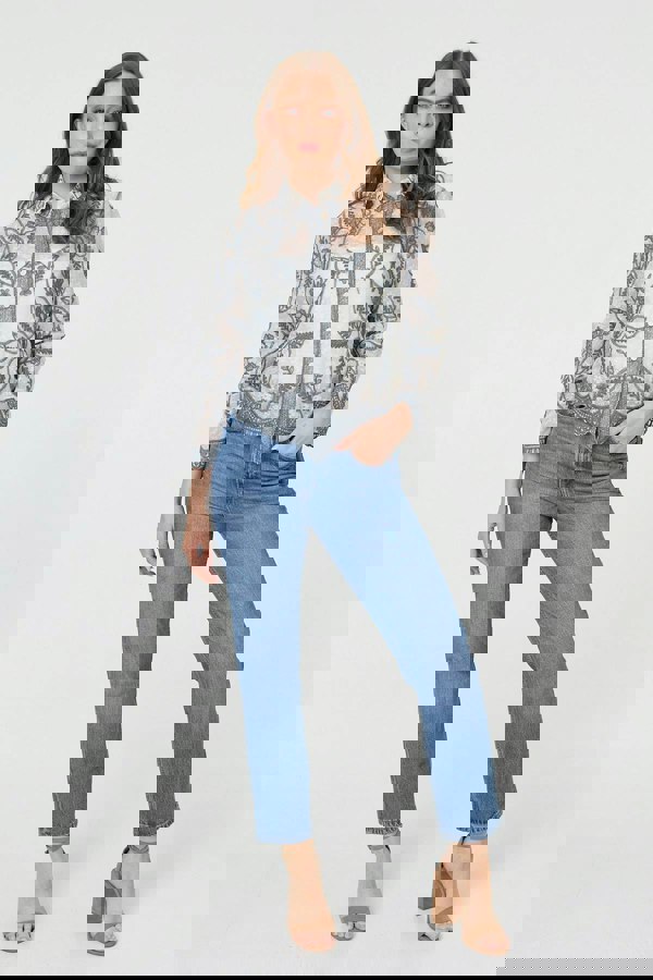 This beautiful shirt is decorated with embroidered details and semi sheer mesh textures. It has long sleeves and a collar, with matching buttons and a frilled hem. Wear this beautiful shirt unbuttoned over a cami top, or style with smart trousers for a formal dress code.