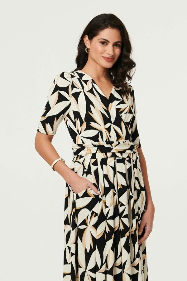 Izabel London brings a considered finish to the Leaf Print 1/2 Sleeve Wrap Midi Dress, combining a wrap front with a ruched waistband and tie waist to shape the silhouette. Cut to a midi length, it’s detailed with a v-neckline and 1/2 sleeves, while pleating through the front adds texture and movement.