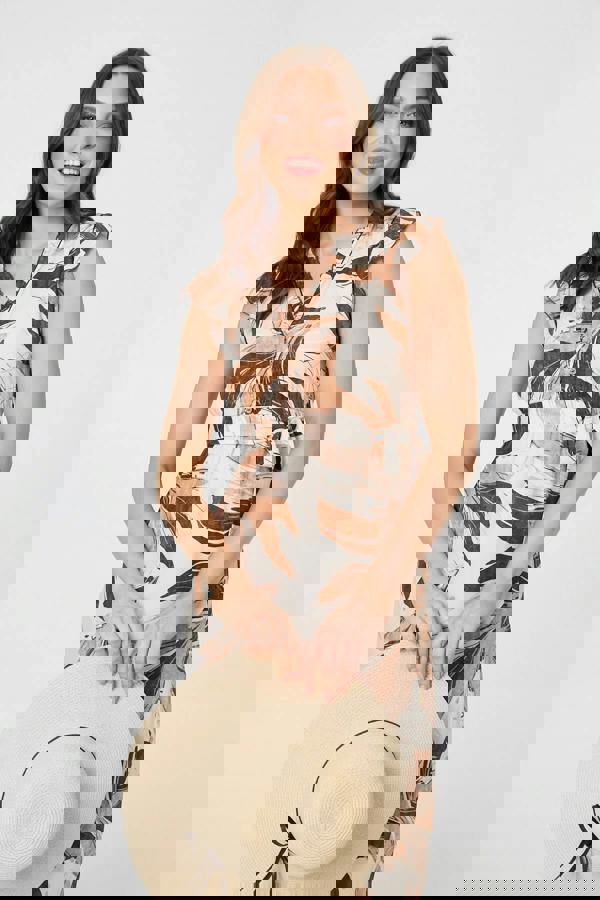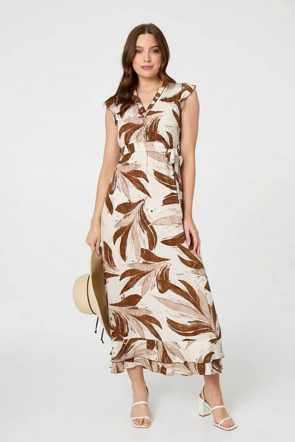 This beautiful maxi dress is perfect for warm weather and evenings out. It has cap sleeves, a v-neck and a tie waist. The maxi skirt has an a-line shape and a layered hem, so it will feel floaty and comfortable around your legs. This dress is also finished with buttons and frilled trims.