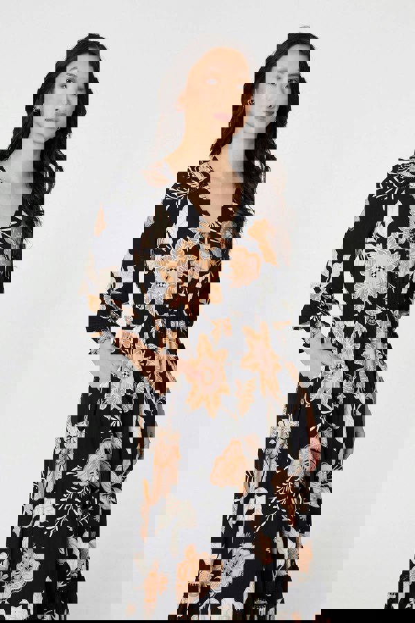 Featuring long sleeves and a soft v-neckline, the dress is finished with button-through front detailing for a classic touch. A shirred waist gently defines the silhouette while offering flexible comfort, before flowing into a tiered midi-to-maxi length skirt that moves beautifully as you walk. Whether styled with boots, trainers or heels, this dress is an easy wardrobe favourite.
