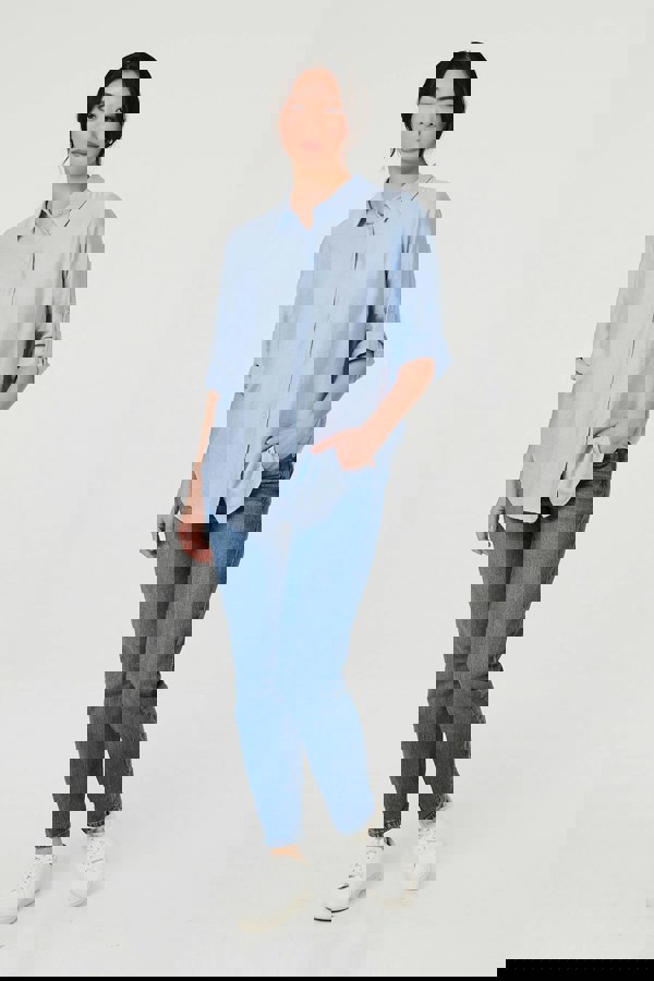 This simple-yet-stylish shirt is a must-have in every wardrobe. It has a collar, long sleeves and a row of front buttons. The relaxed shape and thigh length curved hem mean you can style this with smart or laid-back outfits.