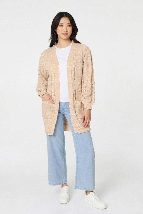 For ultimate cosiness this season, this cardigan is a must-have. It's made from a cable knit texture material and has an oversized fit, complete with an open front shape that is perfect for wrapping around your figure. It has long sleeves, pockets and a thigh length hem.
