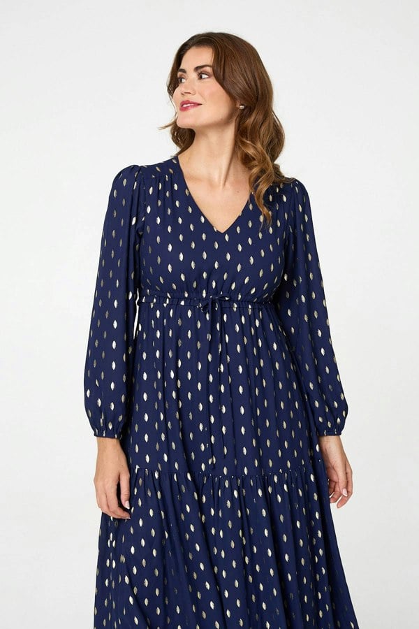 Stay stylish and comfortable at every event this season in this foil printed maxi dress. With a v-neck, tie detail empire waist, long sleeves and a tiered a-line maxi skirt. Style with strappy heels for an elevated occasion.