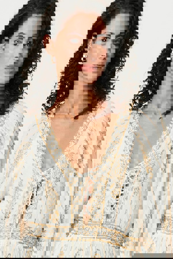 Feel summery and stylish in this stunning knee length dress. It's finished with beautiful metallic details and a tassel on the tie-up neckline. It also has a relaxed fit, 3/4 flared sleeves and a tiered hem. Dress it up with strappy heels for an evening out, or keep it casual with simple sandals.