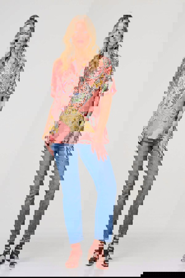Go for a laid-back summertime look with this patchwork print blouse. It's made from a breathable cotton and viscose blend and features a v-neck, 1/2 sleeves and button details. It also has a curved hip length hem and looks stylish paired with blue jeans and sandals.