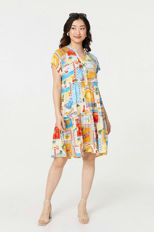 Get a casual look with this knee length summer dress. It has elegant cap sleeves and a relaxed smock shape that will keep you cool on a hot day - and it's also made from 100% viscose for a soft and comfortable fit. It features an empire waist, elegant tiers and buttons on the front. This dress is perfect for a casual day out in the summer.